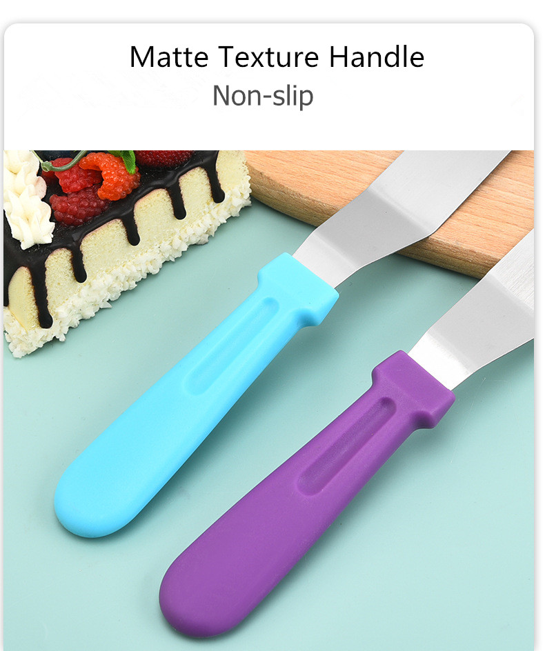 Elevate your baking skills and cake decorating with our Stainless Steel Angled Icing Spatulas.We offer four stylish color choices: vibrant yellow, serene blue, chic pink, and elegant purple,catering to different preferences and aesthetics. Additionally,we provide a custom color option, allowing you to personalize the spatula to align perfectly with your individual style or brand identity.
